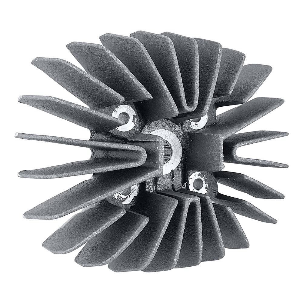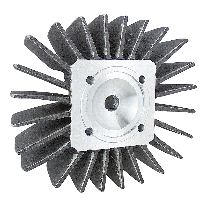 Tuningová hlava válce s vějířovým žebrováním, určená pro motory Pionýr s vrtáním D38 mm. Konstrukce s antidetonační štěrbinou a centrálně umístěnou svíčkou maximalizuje výkon. Doporučuje se použít svíčku s délkou závitu 19 mm a odpovídající tepelnou hodnotou (např. Brisk L15C nebo NGK B7ES). Hlava je odlita do písku, tím je struktura povrchu hrubá.