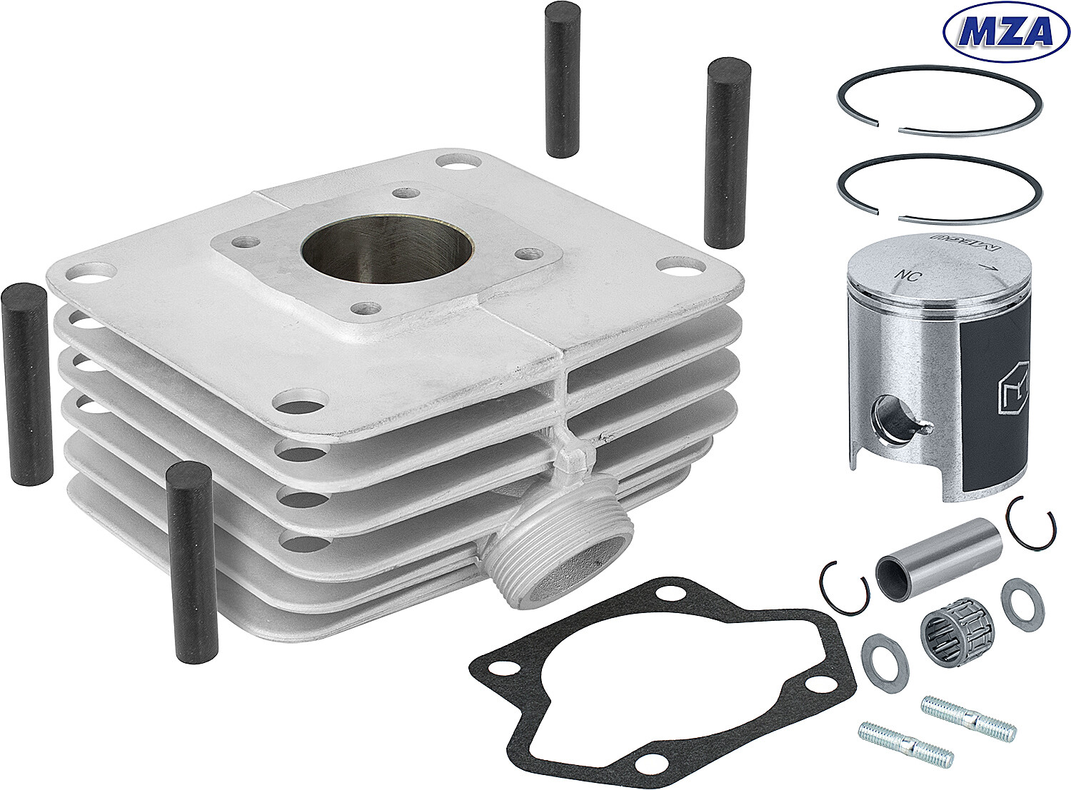 Válec Simson 70 ccm pro modely S51, S70, SR80 s povlakem Nikasil od výrobce MZA v kompletní sadě. Válec nemá litinovou vložku, ta je nahrazena niklo-křemíkovo-karbidovou povrchovou úpravou Nikasil nanesenou přímo na válec, která se používá u moderních závodních motorů. Zabezpečuje lepší kluzné vlastnosti, lepší odvod tepla, vysoký kilometrový nájezd, nižší hmotnost a krátkou dobu záběhu. Přechody kanálů jsou upraveny pro zlepšení výkonu. Před montáží pístu zkontrolujte mezeru pístních kroužků (předepsaná mezera je přibližně 0,2–0,3 mm).